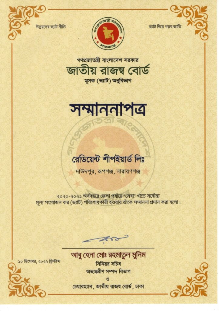 Radiant Shipyard Ltd has been awarded a VAT Honor Card by the National Board of Revenue (NBR) as the highest Value Added Tax (VAT) payer company in the service sector at the district level (Narayanganj District) for the fiscal year:2020-2021.